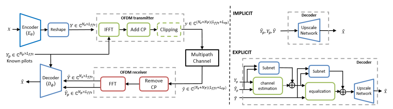 2. 더욱 practical 한 condition, 그중에서도 multipath fading channels에서 작동할 수 있는 프레임워크를 제안하기 위해, DeepJSCC에 OFDM와 Signal Clipping을 도입했다. Decoder은 2가지 방식으로 나뉘는데 각각 BlackBox구조인 IMPLICIT과 Domain knowledge를 이용한 EXPLICIT이다.